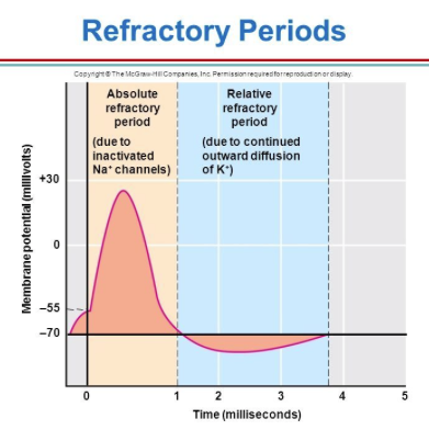 활동전위의 발생은 세포체로부터 축삭이 시작되는 축삭언덕의 전압개폐성 Na+가 열리면서부터 시작됨. 그러나 활동전위의 하강기(4단계)동안에는 전압개폐성 Na+통로가 불활성화되기 때문에 역치 이상의 탈분극자극이 오더라도 활동전위는 발생하지 않음. 이러한 시기를 불응기(refractory period)라고 함.