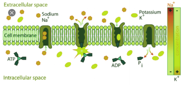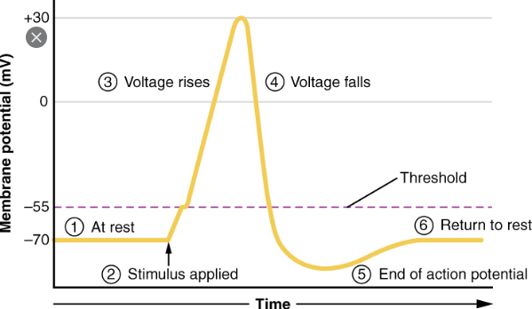3) 막전위가 역치에 이르러 전압개폐성 Na+ 통로가 열려 세포밖에 높은 농도로 존재하던 Na+이 급격하게 세포안으로 유입되면서 막전위는 양의 값까지 빠르게 상승함. 막전위가 Na+의 평형전위에 가까워지면 곧 전압개폐성 Na+는 닫히고 Na+의 유입은 멈춤.