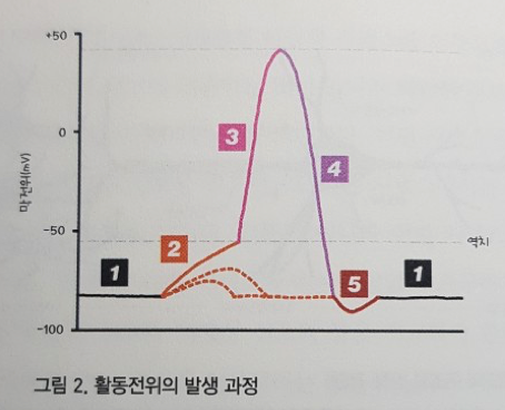 2) 신경전달물질에 의해 이온통로가 열리고 양이온의 유입으로 막전위가 -55mV인 역치까지 탈분극됨. 점선처럼 막전위에 도달하지 못하면 휴지막전위로 돌아감