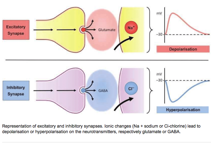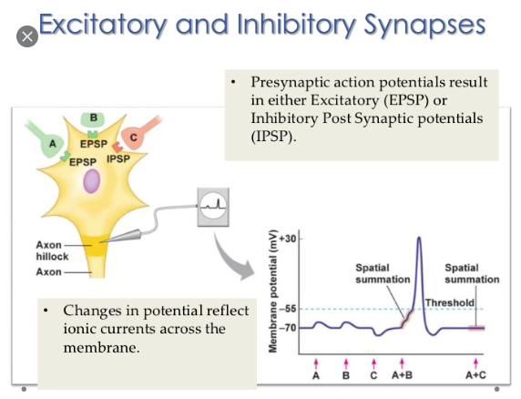 흥분성 신호와 억제성 신호의 세기는 세포막의 이온통로를 통해 신경세포 안으로 이동한 양이온과 음이온의 양에 의해 결정됨. 시냅스에서 분비된 신경전달물질이 수상돌기의 세포막에 존재하는 이온통로에 결합하면 이온통로의 문이 열리고 이온들이 신경세포 안으로 들어옴. 이때 흥분성 신경전달물질에 의해 양이온 통로가 열리고 억제성 신경전달물질에 의해 음이온 통로가 열림. 흥분성 신경전달물질에 의해 신경세포 안으로 들어온 양이온의 양이 음이온의 양보다 많아 역치를 넘어서면 활동전위가 발생하여 정보를 전달함.