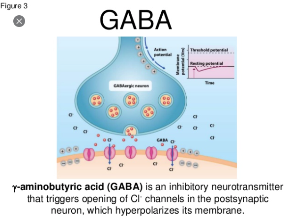 한편 대표적 억제성 신경전달물질인 GABA의 수용체는 음이온인 Cl-를 세포안으로 이동시켜 과분극을 이동하여 활동전위의 발생을 억제함.