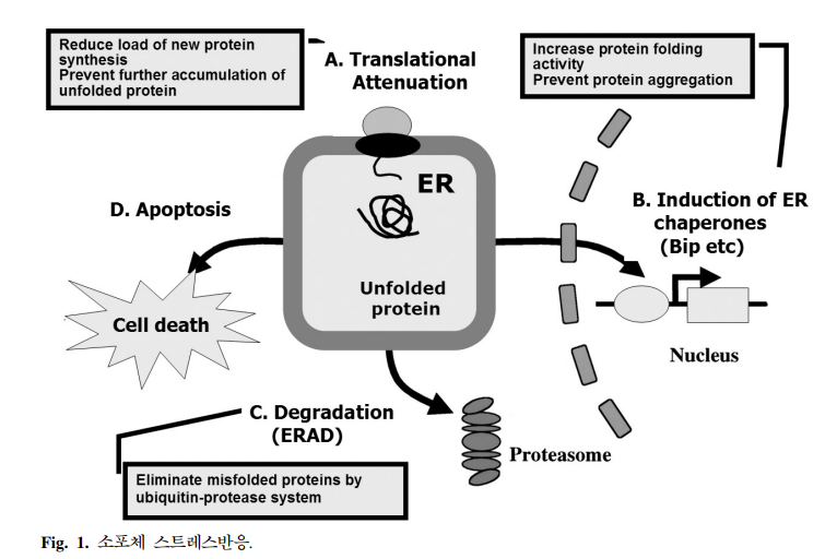 소포체 스트레스가 발생할 경우 세포는 소포체 스트레스를 극복하기 위해 다음과 같은 네 가지의 반응이 일어난다[3~5].