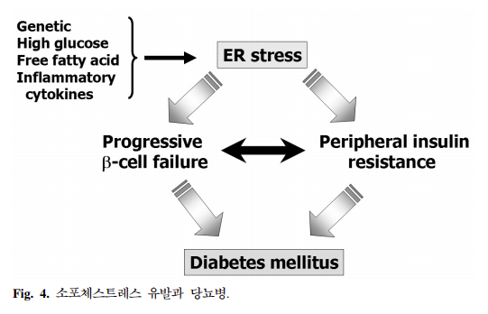 이상의 소포체 스트레스반응으로 세포가 소포체 스트레스를 극복하지 못하면 세포자연사 과정이 작동한다[3]. 소포체 스트레스가 발생하는 동안 여러 가지 세포자연사 경로가 활성화되는데 C/EBP 가족에 속하는 C/EBP homologus protein (CHOP) 유전자의 활성에 의한 세포자연사가 대표적인 예이다. CHOP 유전자의 전사활성은 소포체 스트레스 반응시 나타는 상위의 신호전달체계인 PERK, ATF6 및 Ire1의 조절을 받는다[22~24]. CHOP 유전자가 결손(CHOP knock out)된 세포는 소포체 스트레스에 의한 세포자연사에 저항적이며[25,26] 반대로 CHOP 유전자를 과발현시키면 세포자연사가 촉진된다[27]. CHOP 이외에도 소포체막에 존재 하는 시스테인 단백질 분해 효소(ER-membrane proapoptotic cysteine protease)인 caspase-12[28]와 cJUN NH2-terminal kinase (JNK) 경로[29]가 소포체 스트레스에 의한 세포자연사를 유도하기도 한다. 소포체 스트레스와 당뇨병 췌장 베타세포는 소포체가 잘 발달되어 있는 것이 중요한 특징 중의 하나이다. 활성형 인슐린이 만들어지지 위해서는 전전구인슐린(preproinsulin)이 소포체에서 번역 후 수정 (posttranslational modification)의 과정을 통해 이황화결합 (disulfide bond)을 이룬 전구인슐린(proinsulin)으로 바뀌고 이후 C-펩타이드가 분리되어야 한다. 비만 혹은 제2형 당뇨 병의 초기에는 말초조직에서의 인슐린저항성을 극복하고 정상혈당을 유지하기 위해 고인슐린혈증이 관찰된다. 그러나 장기적인 인슐린저항성에 따른 포도당 대사의 항상성을 유지하기 위해 인슐린 합성과 분비의 요구가 지속적으로 증가할 경우 소포체 내로 전전구인슐린의 유입이 증가하여 소포체 스트레스를 유발할 수 있다[3]. 그러므로 소포체의 원활한 기능이 베타세포의 기능에 중요한 역할을 하고 소포체 스트레스에 의한 베타세포의 기능이상이 당뇨병을 유발할 것으로 생각할 수 있다(Fig. 4).