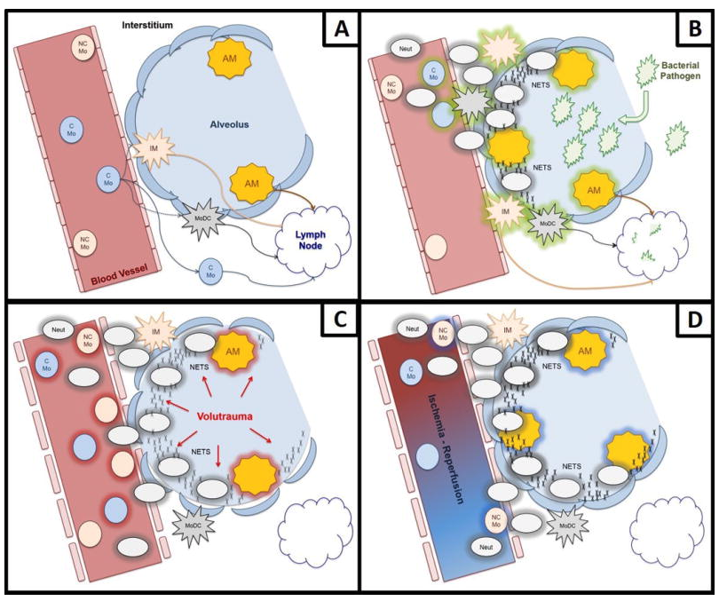 Patients undergoing lung transplant are subject to a multitude of infectious and inflammatory insults. These include ischemia-reperfusion injury (IRI), mechanical ventilation, and infection by commensal and lung pathogens. Any of these insults can result in primary graft dysfunction (PGD), acute lung injury, and acute respiratory distress syndrome, depending on the etiology (Figure 1B through through1D).1D). In the worst lung injury phenotypes, regardless of etiology, neutrophils infiltrate the alveolar space and neutrophil extracellular traps (NETS) are formed (30–33). When released, NETS are meant to help capture and facilitate removal of pathogens (34). However, when the inflammatory response becomes overwhelming, NETS can become pathogenic and contribute to the cycle of atelectrauma, ineffective gas exchange across the alveolar-capillary barrier, and respiratory failure. A review of neutrophils is beyond the scope of this review. However, it is important to understand their role in inflammation, as they are frequently the effector cells recruited by monocytes and macrophages. Infiltration of the lung by neutrophils and the presence of NETS are also frequently used as signs of severe lung injury.