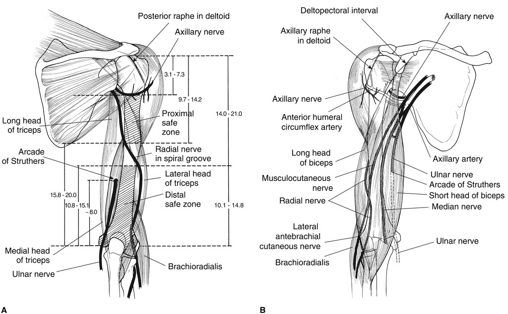 Millesi는 팔꿈치와 손목의 maximal flexion에서 extension시 median nerve 의 경우 먼쪽으로 2-3 cm 이동하고 ulnar nerve는 1 cm 가까운쪽으로 이동한다고 보고함