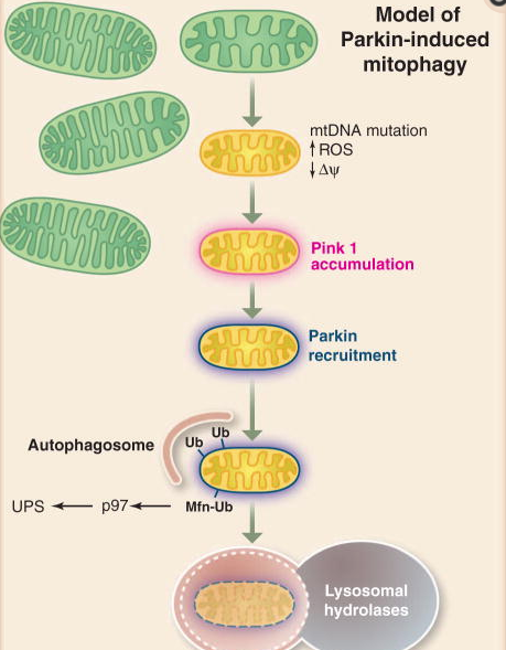 Can mitophagy cleanse genotoxic stress in addition to proteotoxic stress? Mutations in mtDNA accumulate as mammals age and could accumulate generation after generation were it not for germline purification of mtDNA. Although the mechanisms are not yet known, mitochondrial genomes with strong deleterious mutations can be removed during oogenesis (38, 39). Models for this cleansing mechanism include selective expansion of less impaired mitochondria to populate oocytes, apoptosis of oocytes with excessive mutant mtDNAs, and removal of poorly functioning mitochondria by mitophagy. Whether mutated mtDNA is selectively removed from somatic cells is not known.