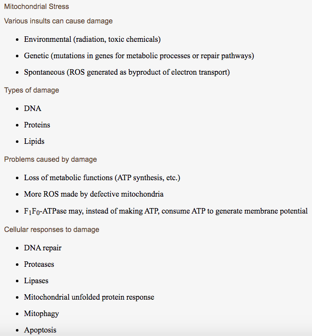 Mitochondria continually produce highly reactive superoxide anions as a byproduct of electron transport during oxidative phosphorylation. These reactive oxygen species (ROS) damage proteins, lipids, and DNA (Box 1). Damage to proteins in the electron transport chain may worsen the situation by producing even more ROS (13). Mitochondria use quality-control proteases to eliminate damaged proteins (14) and respond to unfolded protein stress in the matrix through transcriptional induction of chaperone expression (15). Damaged mitochondrial outer membrane proteins also may be removed by the ubiquitin proteasome quality-control pathway (16). Mitochondria respond to genotoxic damage by some, but not all, of the DNA repair pathways found in the nucleus. These proteotoxic and genotoxic damage-response pathways target individual molecules for quality control, thereby rescuing mitochondria with minor damage without the need for altered fission or fusion rates (14). Another level of quality control entails the wholesale elimination of mitochondria by autophagy, a process that is linked to mitochondrial fission and fusion.