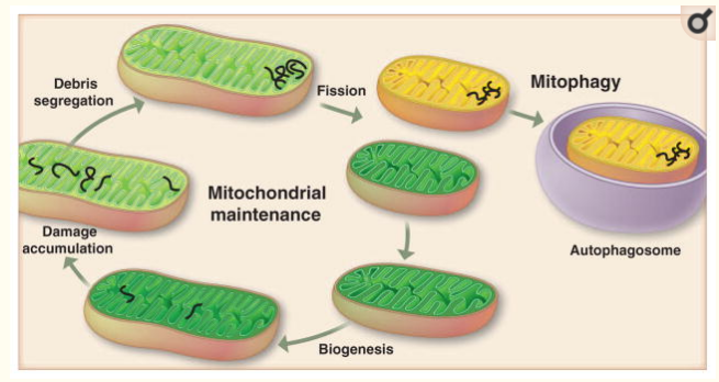 Fusion allows mitochondria to compensate for one another’s defects by sharing components and thereby helps maintain energy output in the face of stress. However, when a certain threshold of damage is reached, mitochondria are eliminated wholesale by autophagy. Fission segregates the most seriously damaged mitochondria to preserve the health of the mitochondrial network in addition to regulating morphology and facilitating mitochondrial trafficking. The highly dynamic mitochondrial fusion and fission cycle is proposed to balance two competing processes: compensation of damage by fusion and elimination of damage by fission. Failure of these stress responses may lead to neuron death and neurodegenerative disorders. In-depth understanding of mitophagic processes could aid the development of new treatments for mitochondrial and neurodegenerative diseases: It was recently shown that reactivation of autophagy can mitigate certain other diseases, such as muscular dystrophies associated with mitophagy (45).