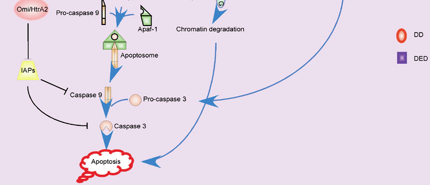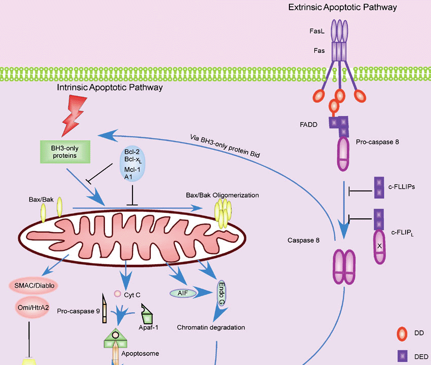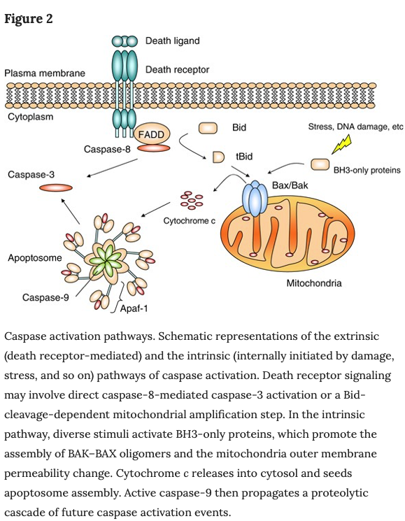 두 기작 다 궁극적으로는 caspase라는 세포 내 단백질 분해효소의 활성화를 통해 세포사멸을 유도하게 된다. 이러한 세포 사멸기작은 모든 세포내에 존재하고 있으며 역치값을 넘는 외부 혹은 내부의 스트레스를 세포가 접하는 경우 항상 활성화될 준비를 하고있다.