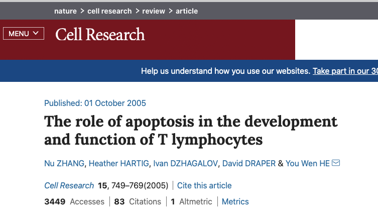 Apoptosis plays an essential role in T cell biology. Thymocytes expressing nonfunctional or autoreactive TCRs are eliminated by apoptosis during development. Apoptosis also leads to the deletion of expanded effector T cells during immune responses. The dysregulation of apoptosis in the immune system results in autoimmunity, tumorogenesis and immunodeficiency. Two major pathways lead to apoptosis: the intrinsic cell death pathway controlled by Bcl-2 family members and the extrinsic cell death pathway controlled by death receptor signaling. These two pathways work together to regulate T lymphocyte development and function.