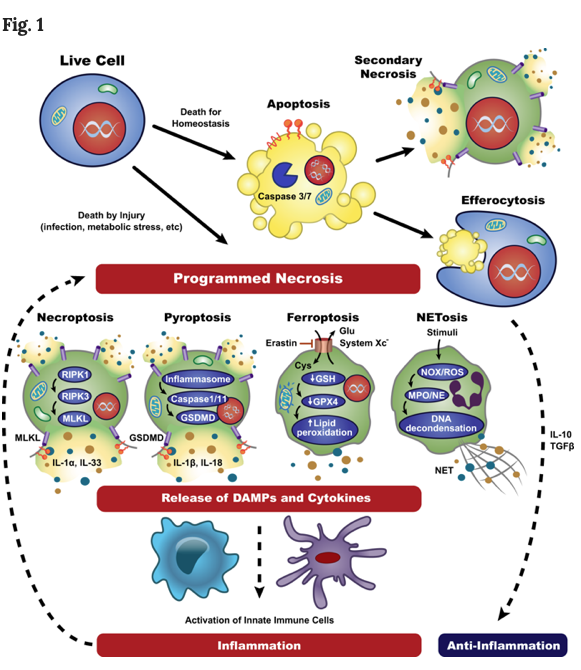 최근에는 TNFα 관련 programmed necrosis 기작이 발견되었으며 이 발견은 apoptosis처럼 necrosis도 자살기작을 통해 일어나는 것을 규명하였다(T. Vanden Berghe et al.). 이들 기작은 apoptosis 처럼 정해진 프로그램에 의해 세포의 괴사기작이 발생하는 것으로 necroptosis라고 명명을 하여 기존 necrosis와는 다른 기작으로 분류하고 있다. 이 기작은 일반적으로 extrinsic apoptosis에 의해 억제되고 있으나 바이러스 등에 의해 extrinsic apoptosis작용이 막히게 될 경우 necroptosis가 발생 감염된 세포에 대한 면역반응을 유도하게 된다. 결국 necroptosis는 apoptosis와는 다르게 급성면역반응을 유도하며 폐혈증, IBD 등을 야기시키는 주요원인으로 최근 주목을 받고 있다. 이들 기작에 관련되어 새로이 규명되고 있는 인자로는 RIPK3, MLKL 등이 있으며 이들 인자는 전 세계적으로 programmed cell death 분야에서 많은 주목을 받으며 연구되고 있다. 아직까지는 이들 기작과 인간의 질병 관련성이 급성면역질환인 폐혈증, 허혈 및 재관류(ischemica-reperfusion), 감염 등의 증상에서 연구가 되고 있으나 앞으로 퇴행성 성인질병, 암, 뇌질환 등 다양한 분야로 퍼져나갈 것으로 기대하고 있다.