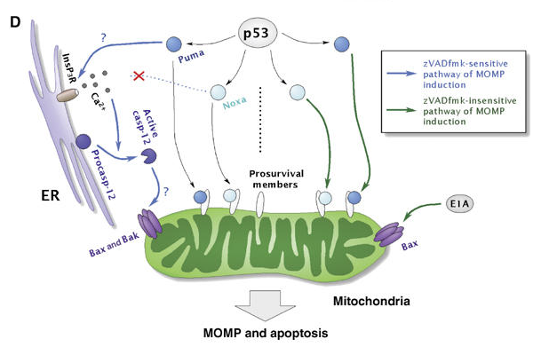 The activation of tumor suppressor p53 induces apoptosis or cell cycle arrest depending on the state and type of cell, but it is not fully understood how these different responses are regulated. Here, we show that Puma and Noxa, the well-known p53-inducible proapoptotic members of the Bcl-2 family, differentially participate in dual pathways of the induction of apoptosis. In normal cells, Puma but not Noxa induces mitochondrial outer membrane permeabilization (MOMP), and this function is mediated in part by a pathway that involves calcium release from the endoplasmic reticulum (ER) and the subsequent caspase activation. However, upon E1A oncoprotein expression, cells also become susceptible to MOMP induction by Noxa, owing to their sensitization to the ER-independent pathway. These findings offer a new insight into differential cellular responses induced by p53, and may have therapeutic implications in cancer.