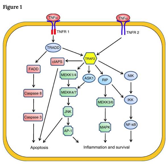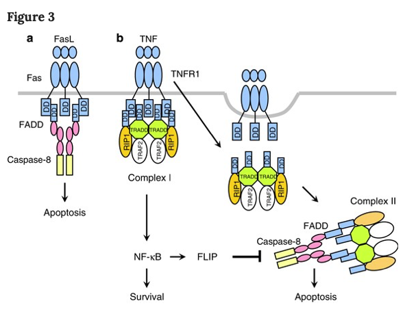 그러나 이들 과정은 AP-1과 NFκB 전사반응 등 세포의 생존 시그널도 동시에 보냄으로 하여 감염 정도에 따라 세포의 운명이 결정된다고 할 수 있다(L. M. Sedger and M. F. McDermott). 간단하게 TNF의 기작을 설명하면 TNF가 TNFR1에 결합하는 경우 RIP1 단백질은 TNFR1의 Death Domain(DD)에 결합을 하게 되며 결합된 RIP1은 cIAP1과 TRAF2에 의해 Lys63번이 연결되는 linear ubiquitination이 일어나게 된다. linear ubiqutination된 RIP1은 NFκB 상위인자인 TAB2/3, TAK1과 결합하고 NEMO/Iκκβ/Iκκα를 활성화시켜 IκB의 인산화를 유도하게 되며 결과적으로 NFκB는 억제인자인 IκB로부터 분리되고 면역반응 및 세포 생존반응을 유도하게 된다. 그러나 linear ubiquitination이 된 RIP1에 의한 NFκB의 활성은 linear ubiquitination이 빠르게 CYLD와 A20등의 분자에 의해 제거되면서 멈추게 되고 RIP1이 수용체에서 떨어지면서 RIP1/FADD/Caspase 8 complex II 구조가 형성된다. 이 구조는 caspase 8의 활성을 유도 발생 세포사멸작용이 일어나게 된다.