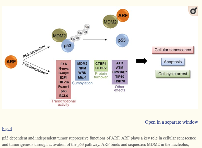 궁극적으로는 암화를 막기 위해 세포는 p53에 의한 Bax, Noxa, Puma등의 발현을 유도시켜 마이토콘드리아의 기능을 파괴하고 세포의 사멸을 유도하게 된다. 인간에게 발생하는 많은 암에서 p53이나 p14ARF, RB, INK4a의 기능이 돌연변이나 혹은 후성유전체 변화에 의해 억제되고 동시에 RAS 혹은 성장호르몬 수용체 등의 암유도 유전자가 활성화되어 있는 것은 세포의 암화에 있어서 이들 암억제 단백질 역할의 중요성을 증명해 주고 있다(A. G. Stephen et al.).