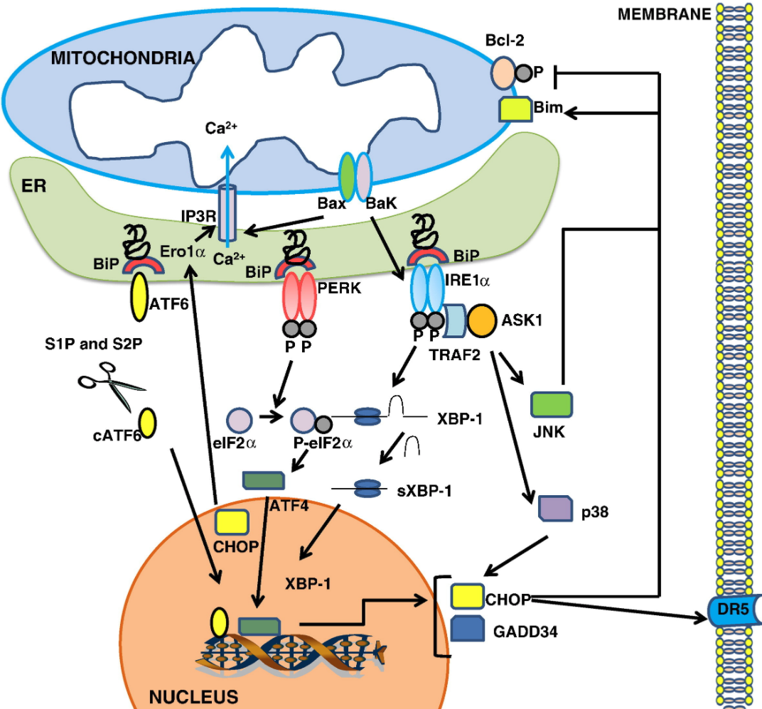 Accumulation of unfolded protein recruits BiP to the ER lumen and its dissociation from IRE1α, ATF6 and PERK leads to their activation. Upon dimerization and autophosphorylation, IRE1α splices XBP-1 mRNA, which adjusts the reading frame to allow translation of an active transcriptional factor XBP-1. XBP-1 up-regulates UPR genes encoding ER chaperones and components of the ERAD machinery. IRE1α can also recruit TRAF2 and ASK1, leading to downstream activation of JNK and p38 MAPK. Activated JNK translocates to the mitochondrial membrane and promotes (a) activation of Bim and (b) inhibition of Bcl-2, whereas p38 MAPK phosphorylates and activates CHOP. CHOP can induce transcriptional activation of genes that contribute to cell death, including Ero1α (hyperoxidizes the ER and activates IP3R) and DR5 (promotes caspase 8-dependent cell death). Bax and Bak can also (a) bind to and activate IRE1α and (b) induce release of Ca2 + from the ER. PERK phosphorylates elF2α and attenuates protein translation. However, translation of selected mRNAs is favored under these conditions, including ATF4, which then induces expression of CHOP and GADD34. Activated ATF6 translocates to the Golgi where its cytosolic domain is cleaved by the proteases, S1P and S2P. The cleaved ATF6 fragment forms an active transcriptional factor that mediates expression of several components important for protein folding, degradation, and ER expansion.