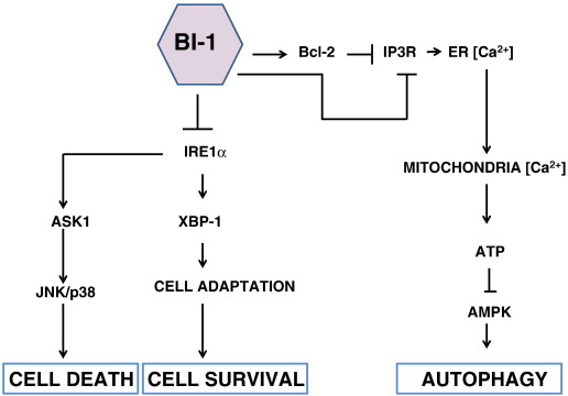 Fig. 2. Dual function of BI-1 in ER stress and autophagy. BI-1 modulates ER stress and autophagy by independent mechanisms. BI-1 suppresses IRE1α by forming a complex with IRE1α, which then nullifies both its endoribonuclease (XBP-1) and kinase activity (JNK). Via an IP3R-dependent mechanism, BI-1 also reduces the steady-state levels of ER Ca2 +, which causes a corresponding decline in mitochondrial Ca2 + levels and reduces mitochondria bioenergetics. Reduction in ATP levels (rise in AMP) activates the intracellular energy sensor AMPK, which activates autophagy via effects on Atg1 (Ulk1/Ulk2). BI-1 has also been shown to associate with Bcl-2 to regulate Ca2 + homeostasis, which could also indirectly influence autophagy.