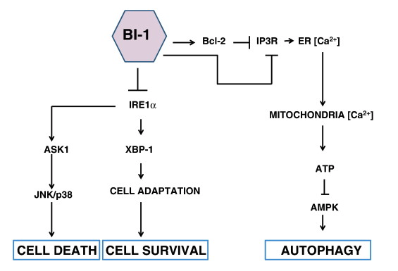 It has been reported that BI-1 suppresses IRE1α activity in both fly and mouse models of ER stress by forming a complex with IRE1α, which then nullifies its endoribonuclease activity [34]. For instance, knocking out the gene encoding BI-1 consistently led to hyperactivity of the IRE1α pathway. Conversely, cells over-expressing BI-1 showed reduced IRE1α kinase and endoribonuclease activity, whereas a C-terminal mutant of BI-1 that fails to bind IRE1α did not suppress IRE1α activity and lacked cytoprotective activity. Stress kinase activation induced by ER stress is also blunted by BI-1 [35], which has implications for control of both cell death and autophagy. Additionally, BI-1 deficiency also increases the ER/Golgi expansion and the secretory activity of primary B cell, functions controlled by XBP-1, a major downstream effector of IRE1α.