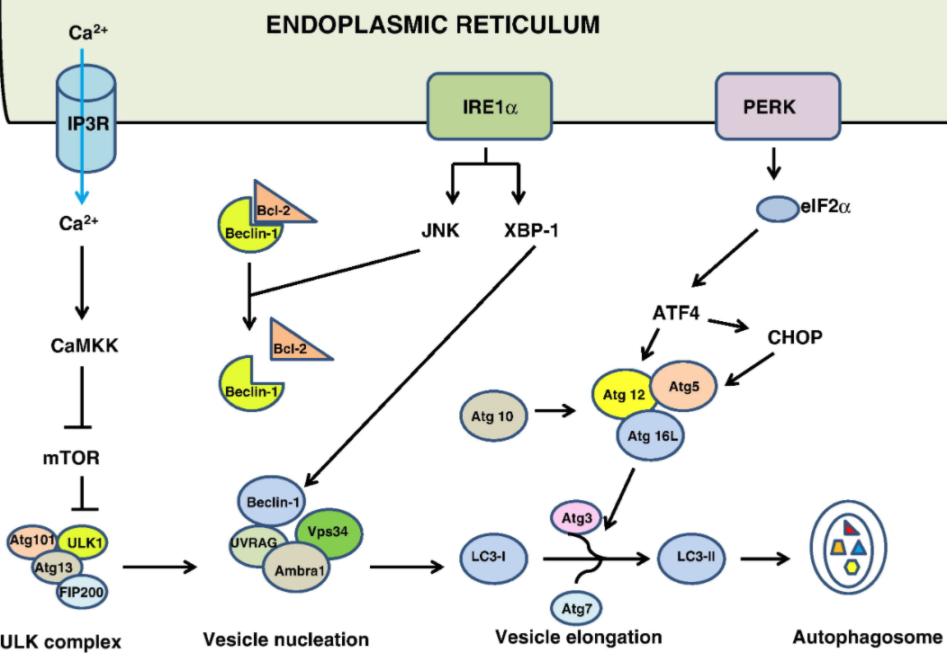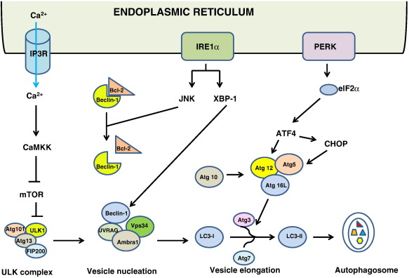 Fig. 3. Cross-talk of ER stress and autophagy. ER stress can induce autophagy, through at least two UPR pathways, PERK-elF2α and IRE1α. Activatedα can recruit TRAF2 and ASK1, which subsequently activates JNK. JNK-mediated phosphorylation of Bcl-2 releases Beclin-1 from its inhibitory interaction with Bcl-2. Free Beclin-1 associates with other members of the ULK1 complex to promote vesicle nucleation. In parallel, spliced XBP-1 can also trigger transcriptional up-regulation of Beclin-1 expression. The elongation process involves two ubiquitin-like conjugation systems that promote the assembly of Atg5-Atg12-Atg16L complex and the LC3 processing (cleavage and lipidation). Activated PERK can induce autophagy through ATF4-driven transcriptional regulation of Atg12 whereas ATF4-mediated CHOP activation can also transcriptionally induce Atg5. Ca2 + release from the ER lumen through the IP3R can activate CaMKK and subsequently relieves mTOR inhibition on the ULK1 complex.