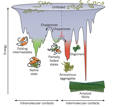 Figure1|Competing reactions of protein folding and aggregation. Scheme of the funnel-shaped free-energy surface that proteins explore as they move towards the native state (green) by forming intramolecular contacts (modified from refs 19 and 95). The ruggedness of the free-energy landscape results in the accumulation of kinetically trapped conformations that need to traverse free-energy barriers to reach a favourable downhill path. In vivo, these steps may be accelerated by chaperones . When several molecules fold