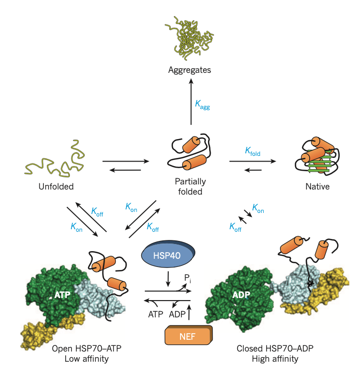 in substrate release. Folding is promoted and aggregation is prevented when both the folding rate constant (Kfold) is greater than the association constant (Kon) for chaperone binding (or rebinding) of partially folded states, and Kon is greater than intermolecular association by the higher-order aggregation rate constant Kagg (Kfold > Kon > Kagg) (kinetic partitioning). For proteins that populate misfolded states, Kon may be greater than Kfold (Kfold ≤ Kon > Kagg). These proteins are stabilized by HSP70 in a non-aggregated state, but require