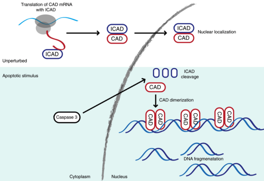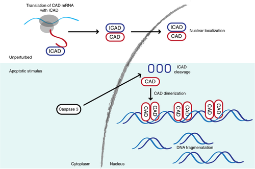 Regulation and apoptotic activation of the CAD. The nuclease activity of CAD is restricted by association with its inhibitor, ICAD. The association of CAD with ICAD begins with the translation of CAD mRNA. Here ICAD acts as a chaperone to ensure CAD is properly folded. The CAD–ICAD complex then translocates to the nucleus. Inactivating cleavage of ICAD by activated caspases, releases CAD from inhibition, and facilitates CAD homodimerization. The scissor‐like CAD–CAD dimer creates double‐stranded DNA breaks across the genome resulting in DNA fragmentation.