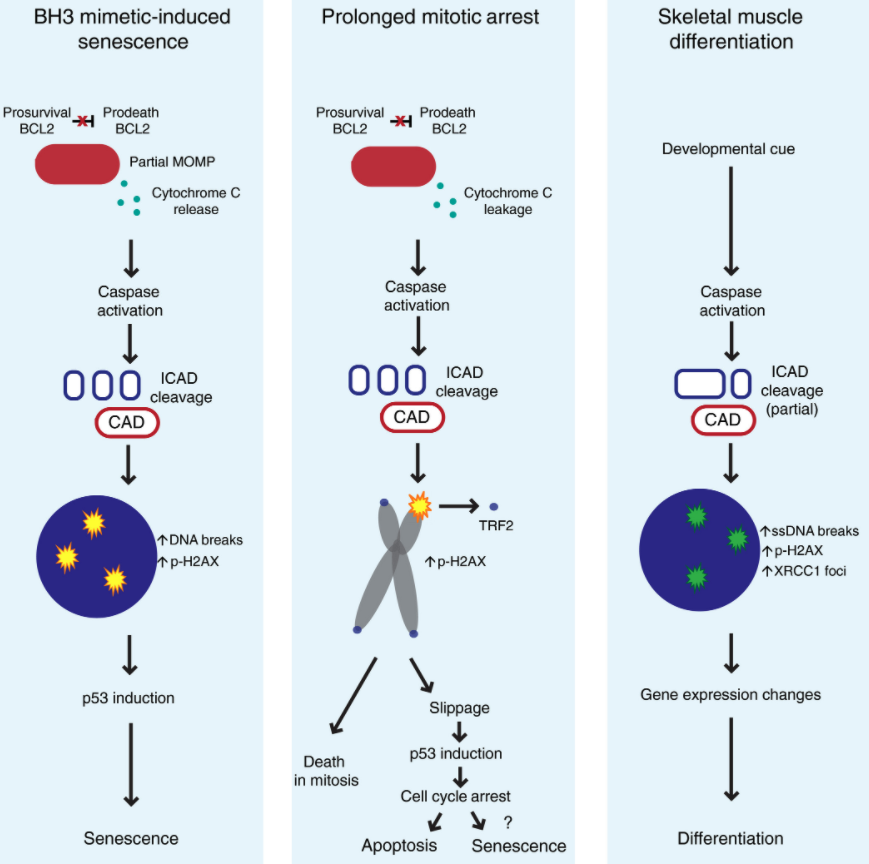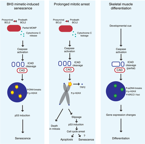 CAD promotes nonapoptotic cell fates. BH3‐mimetic induced senescence. Exposure to BH3‐mimetics in resistant cells leads to partial MOMP of the mitochondria releasing a limited amount of cytochrome c into the cytoplasm. This release initiates a subapoptotic caspase signal sufficient to inactivate ICAD and promote CAD‐induced DNA damage. This DNA damage initiates p53 signaling that directs the cells into a senescent state. Prolonged mitotic arrest. Leakage of cytochrome c from the mitochondria into the cytoplasm initiates subapoptotic caspase activation. At the terminal of this activation, ICAD is inactivated and CAD induces DNA breaks at telomeric regions that trigger the removal of the shelterin component TRF2. Slippage of the cells into interphase with CAD‐induced telomeric damage initiates a p53 response that determines the cell fate. (adapted from [31] ) Skeletal muscle differentiation. Skeletal muscle utilizes the subapoptotic caspase activity to propel differentiation. The subapoptotic caspase activity promotes ssDNA breaks by the activation of CAD through partial cleavage of ICAD. The formation and repair of CAD‐induced ssDNA breaks promotes gene expression changes that propel skeletal muscle differentiation.