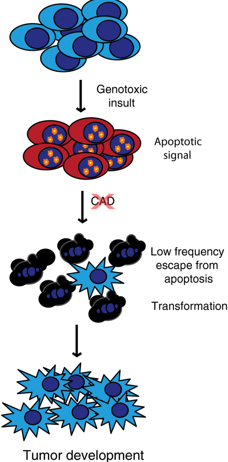 CAD promotes efficient apoptosis to suppress tumor development. Exposure to genotoxic stress initiates a tumor‐suppressive apoptotic signal leading to the removal of damaged cells. The efficiency of the process restricts cells with potentially transformative mutations from recovering from the apoptotic stimuli. Here, by promoting efficient apoptosis, CAD exerts a tumor‐suppressive function. Interference with CAD's activity could tip the balance toward survival in a limited number of cells. These escaped cells may possess transformative mutations and progress to form tumors.