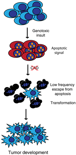 Maintenance of genome stability is an extensively regulated and effective process that ensures homeostasis of an organism. However, breakdown in this stability does occur, leading to diseases including cancer. Numerous sources can account for genomic stress and the range of mutations that are presented in cancer. As discussed above, CAD can be activated and inflict DNA breaks under conditions that are not directly leading to apoptosis. These breaks present a stress to genome stability that in a permissive situation could introduce potentially oncogenic mutations [29].
