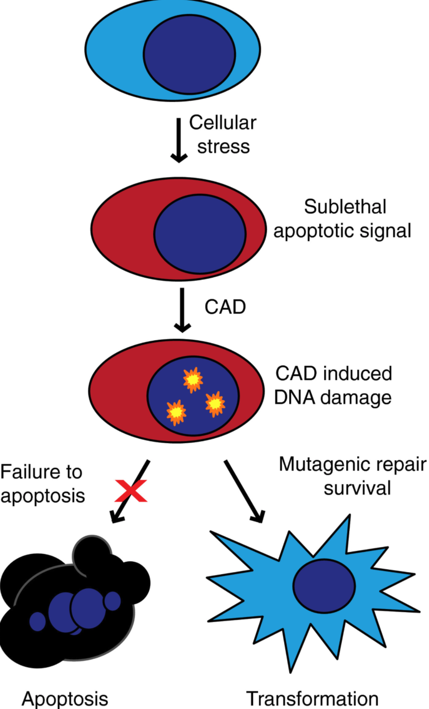 Transformative mutations arising from sublethal apoptotic/CAD signaling. Exposure to cellular stress initiates a sublethal apoptotic response that introduces potentially oncogenic endogenous DNA damage. One of the apoptotic nuclease implicated in this DNA damage is CAD. The DNA damage introduced by the apoptotic nucleases is insufficient to further drive apoptosis. The elevated levels of DNA breaks coupled to infidelity in DNA repair can lead to oncogenic mutations and cellular transformation.