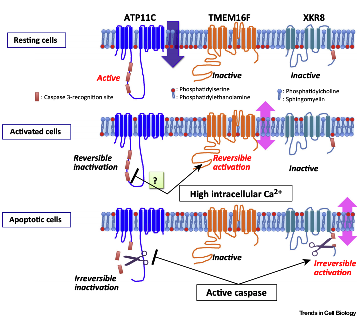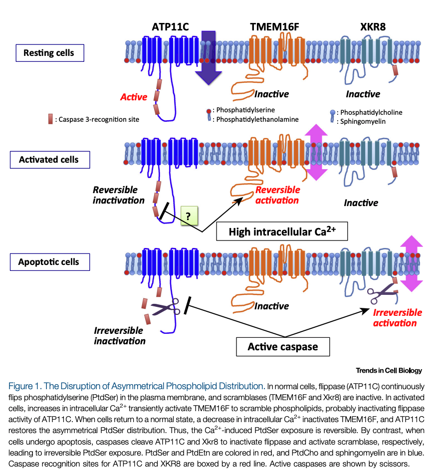 By contrast, when cells undergo apoptosis, caspases cleave ATP11C and Xkr8 to inactivate flippase and activate scramblase, respectively, leading to irreversible PtdSer exposure.