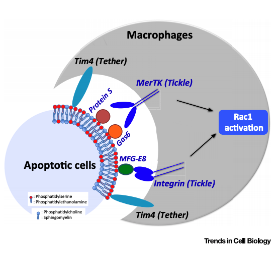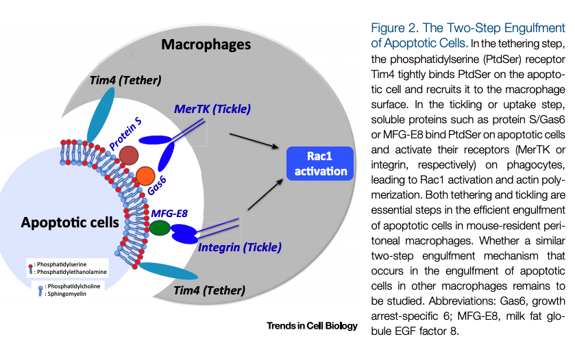 Figure 2. The Two-Step Engulfment of Apoptotic Cells. In the tethering step, the phosphatidylserine (PtdSer) receptor Tim4 tightly binds PtdSer on the apoptotic cell and recruits it to the macrophage surface. In the tickling or uptake step, soluble proteins such as protein S/Gas6 or MFG-E8 bind PtdSer on apoptotic cells and activate their receptors (MerTK or integrin, respectively) on phagocytes, leading to Rac1 activation and actin polymerization. Both tethering and tickling are essential steps in the efficient engulfment of apoptotic cells in mouse-resident peritoneal macrophages. Whether a similar two-step engulfment mechanism that occurs in the engulfment of apoptotic cells in other macrophages remains to be studied.