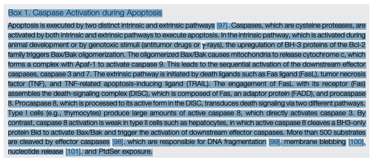 Apoptosis is executed by two distinct intrinsic and extrinsic pathways [97]. Caspases, which are cysteine proteases, are activated by both intrinsic and extrinsic pathways to execute apoptosis. In the intrinsic pathway, which is activated during animal development or by genotoxic stimuli (antitumor drugs or g-rays), the upregulation of BH-3 proteins of the Bcl-2 family triggers Bax/Bak oligomerization. The oligomerized Bax/Bak causes mitochondria to release cytochrome c, which forms a complex with Apaf-1 to activate caspase 9. This leads to the sequential activation of the downstream effector caspases, caspase 3 and 7. The extrinsic pathway is initiated by death ligands such as Fas ligand (FasL), tumor necrosis factor (TNF), and TNF-related apoptosis-inducing ligand (TRAIL). The engagement of FasL with its receptor (Fas) assembles the death-signaling complex (DISC), which is composed of Fas, an adaptor protein (FADD), and procaspase 8. Procaspase 8, which is processed to its active form in the DISC, transduces death signaling via two different pathways. Type I cells (e.g., thymocytes) produce large amounts of active caspase 8, which directly activates caspase 3. By contrast, caspase 8 activation is weak in type II cells such as hepatocytes, in which active caspase 8 cleaves a BH3-only protein Bid to activate Bax/Bak and trigger the activation of downstream effector caspases. More than 500 substrates are cleaved by effector caspases [98], which are responsible for DNA fragmentation [99], membrane blebbing [100], nucleotide release [101], and PtdSer exposure.