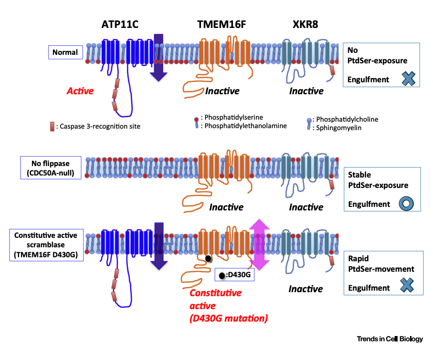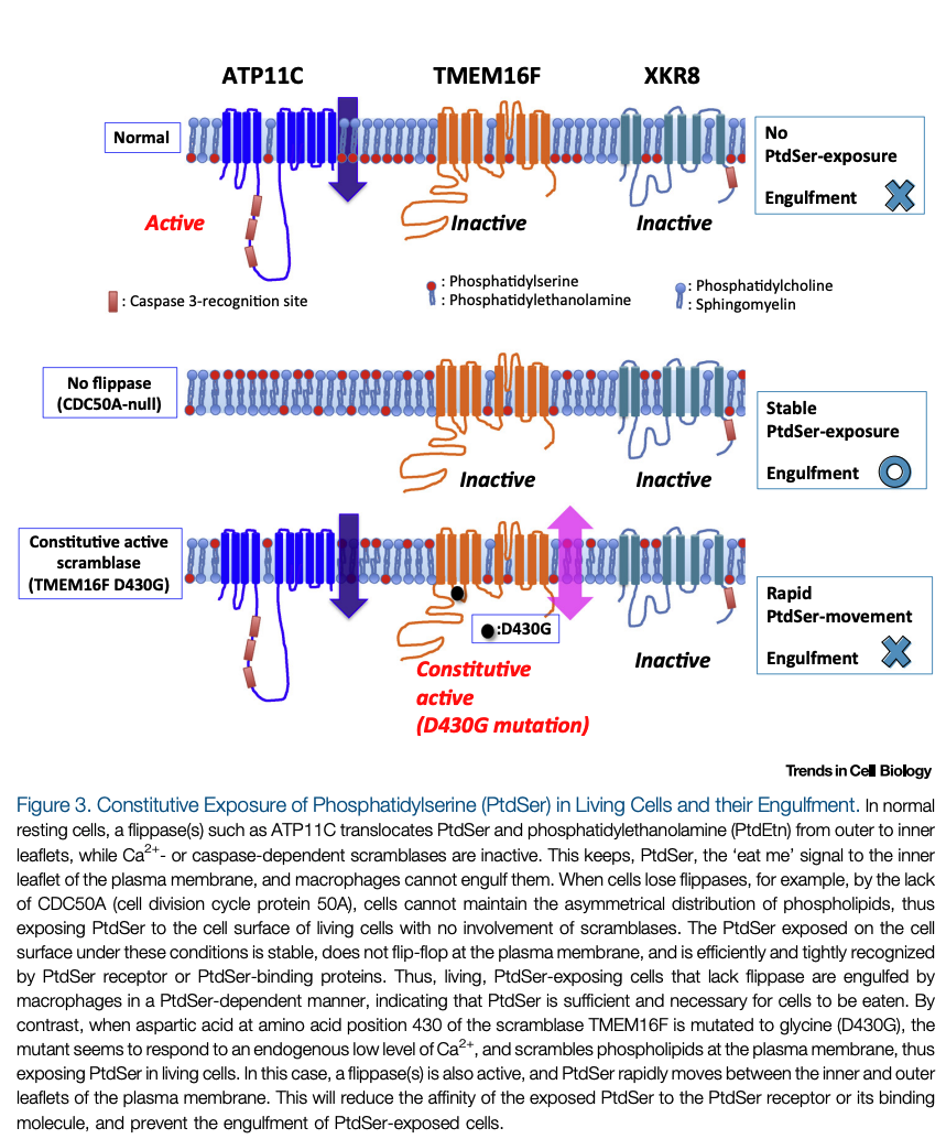 Figure 3. Constitutive Exposure of Phosphatidylserine (PtdSer) in Living Cells and their Engulfment. In normal resting cells, a flippase(s) such as ATP11C translocates PtdSer and phosphatidylethanolamine (PtdEtn) from outer to inner leaflets, while Ca2+- or caspase-dependent scramblases are inactive. This keeps, PtdSer, the ‘eat me’ signal to the inner leaflet of the plasma membrane, and macrophages cannot engulf them. When cells lose flippases, for example, by the lack of CDC50A (cell division cycle protein 50A), cells cannot maintain the asymmetrical distribution of phospholipids, thus exposing PtdSer to the cell surface of living cells with no involvement of scramblases. The PtdSer exposed on the cell surface under these conditions is stable, does not flip-flop at the plasma membrane, and is efficiently and tightly recognized by PtdSer receptor or PtdSer-binding proteins. Thus, living, PtdSer-exposing cells that lack flippase are engulfed by macrophages in a PtdSer-dependent manner, indicating that PtdSer is sufficient and necessary for cells to be eaten. By contrast, when aspartic acid at amino acid position 430 of the scramblase TMEM16F is mutated to glycine (D430G), the mutant seems to respond to an endogenous low level of Ca2+, and scrambles phospholipids at the plasma membrane, thus exposing PtdSer in living cells. In this case, a flippase(s) is also active, and PtdSer rapidly moves between the inner and outer leaflets of the plasma membrane. This will reduce the affinity of the exposed PtdSer to the PtdSer receptor or its binding molecule, and prevent the engulfment of PtdSer-exposed cells.