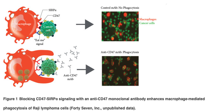 CD47 is a potent ‘do not eat me’ signal that enables cancer cells to evade detection by the innate immune system, thereby avoiding destruction by first responder cells, such as macrophages. CD47 overexpression is common in solid and hematological tumors including acute leukemia, non-Hodgkin’s lymphoma (NHL), colorectal, and ovarian cancers. In many malignancies, its expression correlates with an aggressive phenotype and an overall poor clinical prognosis. Inhibition of CD47 signaling enhances macrophage phagocytic activity, and in preclinical models, leads to impaired tumor growth, inhibition of metastatic spread, and tumor regression. Enhancing the innate immune system’s antitumor response by removing macrophage inhibitory signals is analogous to how classic immune checkpoint inhibitors augment T-cell-mediated adaptive immunity by targeting CTLA4 and PD-1. Furthermore, CD47 blockade and enhanced phagocytosis by antigen-presenting cells can enhance antigen priming of T cells, thereby providing a bridge between the innate and adaptive arms of the immune system. Thus, the inhibition CD47 signaling is a promising strategy for treating a broad range of cancers. A growing number of CD47-targeting agents have recently entered clinical trials.