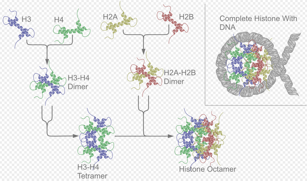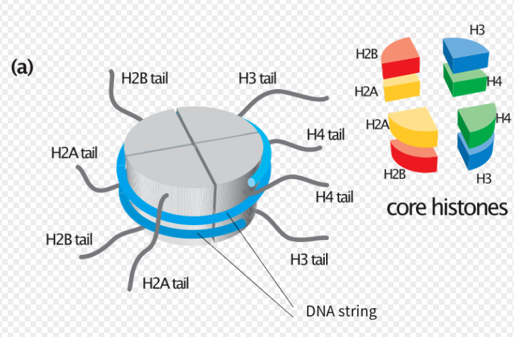 6종류 히스톤이 있음(H1, H2A, H2B, H3, H4, 고균히스톤)