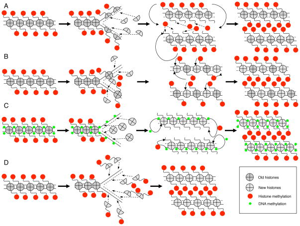 Several current theories exist to explain the propagation of histone PTMs96,146,147 (Figure 1). First, histones on newly synthesized DNA could be immediately modified to maintain an epigenetic memory. Interestingly, studies showing that MLL is retained on mitotic chromatin148 and that PcG proteins remain bound to chromatin during DNA replication149 provide some evidence in support of this hypothesis. Another theory19 suggests that histones are replicated in a semi-conserved manner (Figure 1a); each daughter chromosome would get one half of the histone octamer and then PTMs on the newly introduced histones using the old histones as a template. Alternatively, entire histone octamers could be segregated to each of the daughter strands and the PTMs of new histones could be informed by neighboring marked histones (Figure 1b). Another idea is that DNA methylation could help maintain histone PTM modifications by recruiting methyl modifiers146 (Figure 1c). However it is unknown whether DNA methylation always correlates with inherited histone methylation and DNA methylation has not yet been observed in quantifiable amounts in C. elegans150, which display inheritance of histone methylation marks.