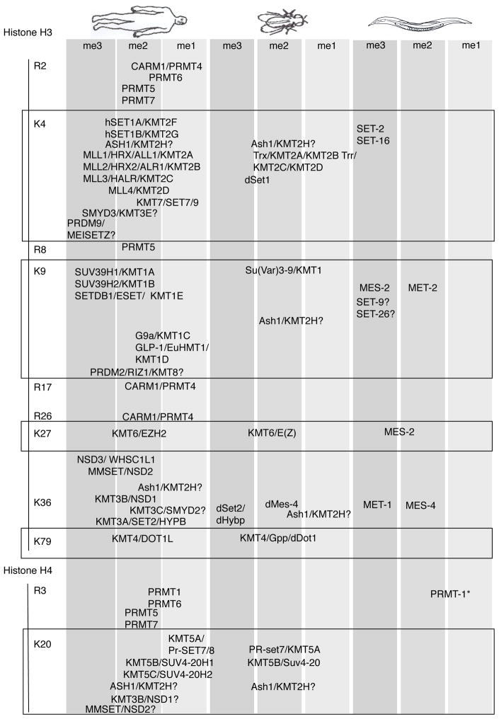 The histone methyltransferases for various lysine and arginine residues are indicated over the specific residues that they have been shown to methylate. Histone methyltransferases, that methylate multiple residues or methylate residues to varying degrees are written over each modification that has been reported. ‘?’ indicates results have not been independently replicated. *: PRMT-1 was shown to mono and asymmetrically dimethylate Histone H4 but the specific residue, which it methylates has not yet been identified. References for individual methyltransferases can be found in Supplementary Information.