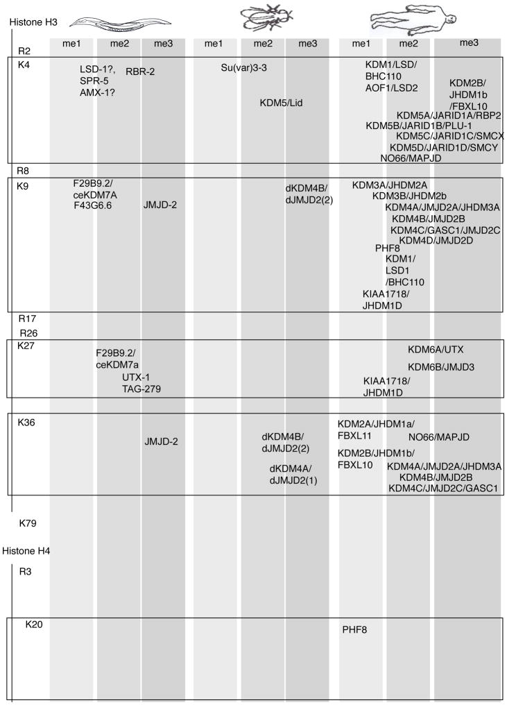 Histone methylation occurs on all basic residues: arginines3, lysines4 and histidines5. Lysines can be mono (me1)4, di(me2)6, or tri(me3)7 methylated on their ε amine group, arginines can be mono(me1)3, symmetrically dimethylated (me2s), or asymemetrically dimethylated(me2a) on their guanidinyl group8, and histidines have been reported to be monomethylated8,9 although this methylation appears to be rare and has not been further characterized. The most extensively studied histone methylation sites include histone H3 lysine 4 (H3K4), H3K9, H3K27, H3K36, H3K79 and H4K20. Sites of arginine methylation include H3R2, H3R8, H3R17, H3R26 and H4R3. However, many other basic residues throughout the histone proteins H1, H2A, H2B, H3 and H4 have also been recently identified as methylated by mass spectrometry and quantitative proteomic analyses (2, reviewed in 10). The functional effects and the regulation of the newly identified methylation events remain to be determined.