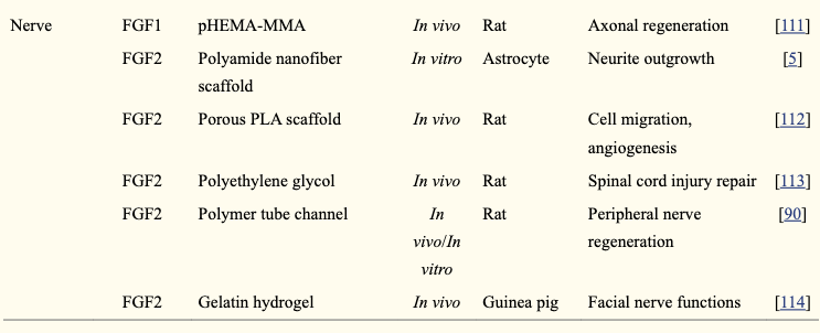 | Nerve | FGF1 | pHEMA-MMA | In vivo | Rat | Axonal regeneration | [111] |