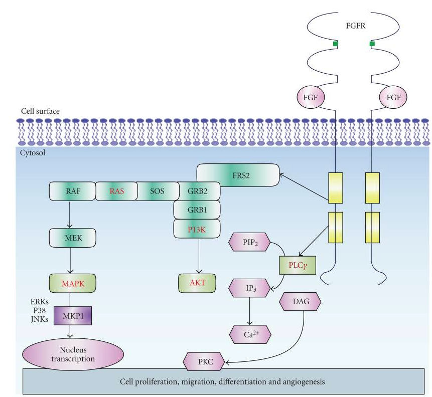 Fibroblast growth factors (FGFs) that signal through FGF receptors (FGFRs) regulate a broad spectrum of biological functions, including cellular proliferation, survival, migration, and differentiation. The FGF signal pathways are the RAS/MAP kinase pathway, PI3 kinase/AKT pathway, and PLCγ pathway, among which the RAS/MAP kinase pathway is known to be predominant.