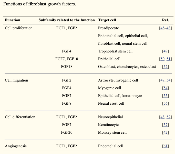 FGFs have various biological functions both in vivo and in vitro, including roles in mitogenesis, cellular migration, differentiation, angiogenesis, and wound healing.