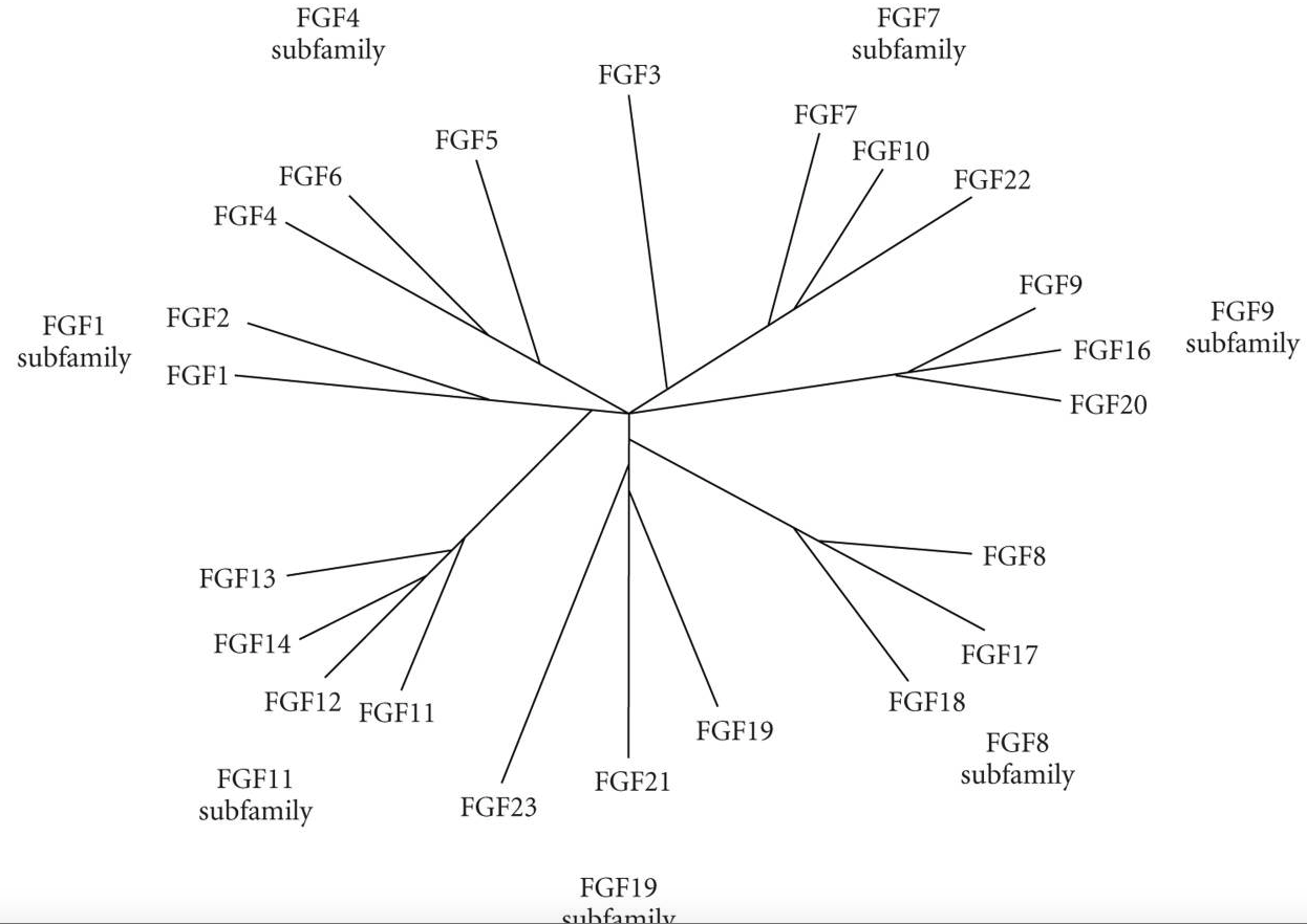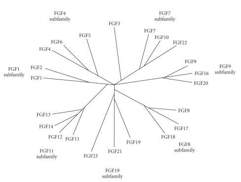 Phylogenetic tree of human FGF family [13]. Human FGF gene family can be divided into seven subfamilies containing two to four members each. Branch lengths are proportional to the evolutionary distance between each gene.