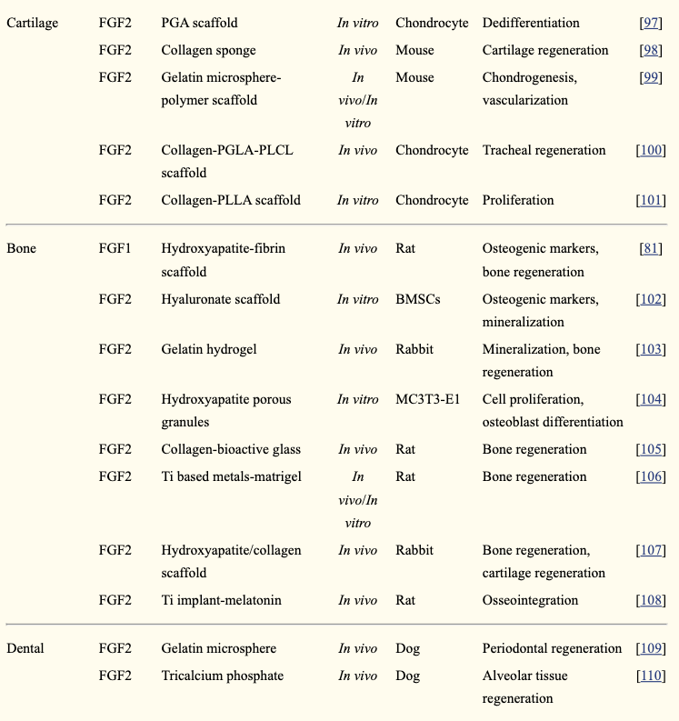 Target tissueSubfamily of FGFMaterials/carriersIn vivo/in vitroAnimal/cellFunctions/effectsRef