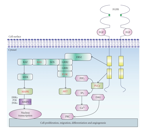 FGFs act as signal molecules that bind and activate FGFRs. Activated FGFRs mediate signaling by recruiting specific molecules that bind to phosphorylated tyrosine at the cytosolic part of the receptor, triggering a number of signaling pathways leading to specific cellular responses. These then serve as docking sites for the recruitment of SH2 (Src homology-2) or PTB (phosphotyrosine binding) domains of adaptors docking proteins or signaling enzymes. Signaling complexes are formed and recruited to the active receptors resulting in a cascade of phosphorylation events [20]. The best understood pathways are the RAS/MAP kinase pathway, PI3 kinase/AKT pathway, and PLCγ pathway. Figure 2 schematically describes the three pathways of the FGF signal, the RAS/MAP kinase pathway, PI3 kinase/AKT pathway, and PLCγ pathway.