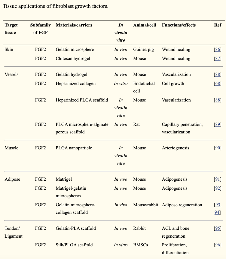 Here, we review the cellular biology of FGFs and their functions in cell proliferation, migration, differentiation, and angiogenesis and address the current development of biomaterials-based delivery systems of FGFs and their applications for tissue regeneration, including skin, blood vessel, muscle, adipose, tendon/ligament, cartilage, bone, tooth, and nerve.