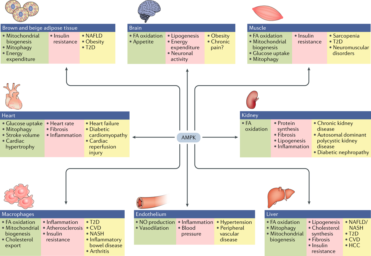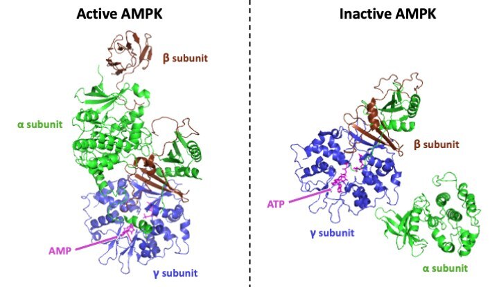 The eukaryotic cell enzyme 5' adenosine monophosphate-activated protein kinase, or AMPK, utilizes AMP for homeostatic energy processes during times of high cellular energy expenditure, such as exercise.[6] Since ATP cleavage, and corresponding phosphorylation reactions, are utilized in various processes throughout the body as a source of energy, ATP production is necessary to further create energy for those mammalian cells. AMPK, as a cellular energy sensor, is activated by decreasing levels of ATP, which is naturally accompanied by increasing levels of ADP and AMP.[7]