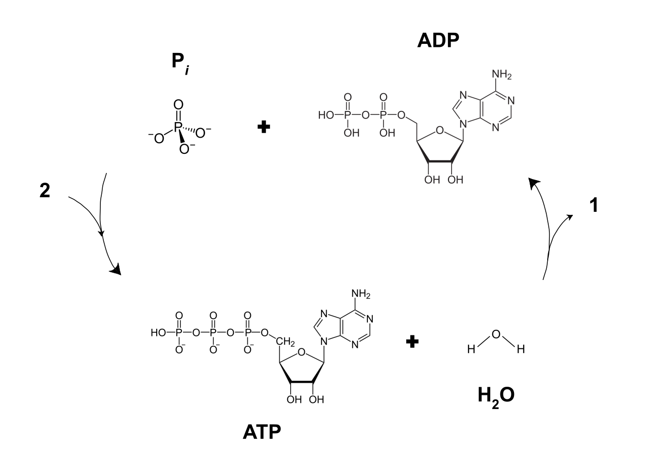 ADP can be interconverted to adenosine triphosphate (ATP) and adenosine monophosphate (AMP). ATP contains one more phosphate group than does ADP. AMP contains one fewer phosphate group. Energy transfer used by all living things is a result of dephosphorylation of ATP by enzymes known as ATPases. The cleavage of a phosphate group from ATP results in the coupling of energy to metabolic reactions and a by-product of ADP.[1] ATP is continually reformed from lower-energy species ADP and AMP. The biosynthesis of ATP is achieved throughout processes such as substrate-level phosphorylation, oxidative phosphorylation, and photophosphorylation, all of which facilitate the addition of a phosphate group to ADP.