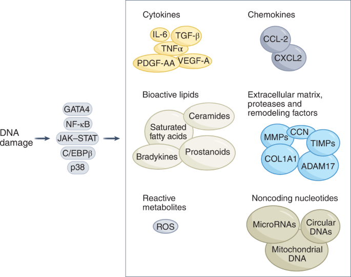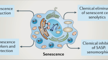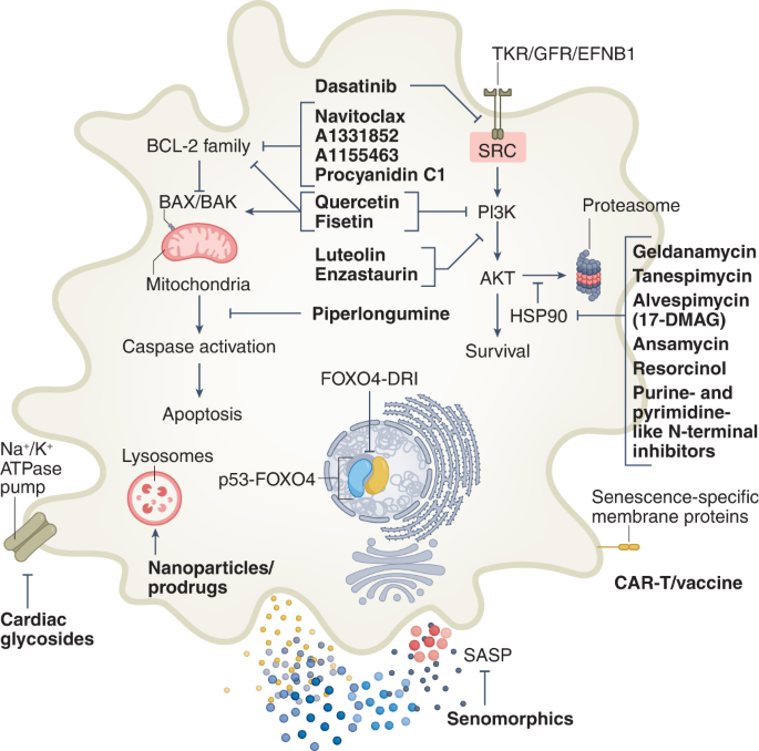Cellular senescence was first reported in 1961 by Hayflick and Moorhead after serially subculturing human fibroblasts37. Senescent cells, which are in a state of essentially irreversible cell cycle arrest but remain viable, can accumulate with aging, especially in more frail individuals, and at pathogenic sites of multiple disorders and diseases in experimental animals and humans across the lifespan. The senescent cell fate can be triggered by a number of stressors including DNA damage, cancerous mutations or oncogene activation, mitochondrial dysfunction, reactive metabolites, hyperoxia or hypoxia, proteotoxic stress, extracellular signals, infections, mechanical or shear stresses that deform cells, resistance exercise and factors secreted by other senescent cells18,38,39,40,41,42,43,44,45,46,47. Many such stressors activate DNA damage response signaling and activation of the p53/p21CIP1/WAF1, p16INK4a/retinoblastoma protein or other pathways, resulting in cell cycle arrest and the development of a senescence-associated secretory phenotype (SASP)24,40,48,49,50,51,52,53 (Fig. 1). Through upregulation of pro-survival and antiapoptotic pathways such as SRC kinases, the PI3K–AKT signaling pathway, heat shock protein (HSP) pathways, serpines, mitochondrial pathways or apoptosis regulator BCL-2-related proteins, those senescent cells with a proapoptotic SASP can survive, despite the cytotoxic microenvironment they create6,7,14,34,35,54,55,56,57,58.