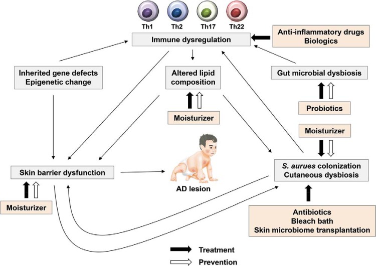 Multiple factors, including epidermal gene mutations, skin barrier dysfunction, immune dysregulation, neuroinflammation, altered lipid composition, and microbial imbalance, can contribute to the development of AD. Various strategies have been used to restore skin barrier function and control skin inflammation in patients with AD. To overcome limitations of topical anti-inflammatory drugs and systemic immunosuppressants, substantial effort has been committed to the development of new therapeutic options, including biologics and microbiome transplantation. In addition, moisturizers and probiotics may prevent the development of AD in infants at high risk. Further advances in our understanding of AD pathophysiology will allow us to achieve a precision medicine approach to the prevention and the treatment of AD.