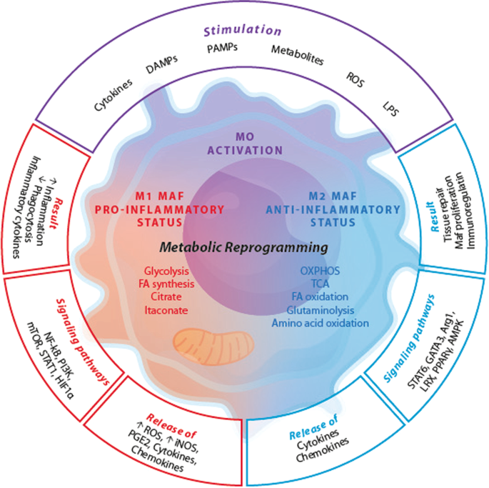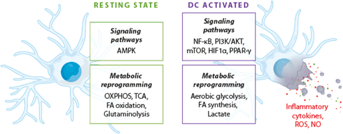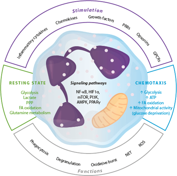 해당 작용은 생리적 조건에서 활성화된 호중구의 주요 에너지원입니다[211]. 이는 염증 환경에서도 마찬가지입니다 [212]. 그러나 호중구는 대사를 조절하여 식균작용, 탈과립, 산화적 폭발, 호중구 세포 외 트랩(NET) 형성, 화학 주성 등 다양한 이펙터 기능을 수행합니다[213]. 여러 증거에 따르면 NET 형성은 해당 작용에 의존하며 젖산염 합성, PPP, 글루타민 대사가 NADPH의 공급원으로서 광범위하게 관여합니다[214, 215]. 이러한 대사 재프로그래밍은 또한 슈퍼옥사이드 생성을 공급하고 침입 병원균의 식균 작용 후 호중구 산화 폭발에 사용되는 ROS와 차아염소산을 유도합니다[211, 216,217,218]. 그러나 화학작용을 뒷받침하는 대사 변화는 다소 복잡하며, 상향 조절된 해당 작용 외에도 미토콘드리아의 기여를 포함합니다[219,220,221]. 이 활동은 화학적 자극을 받은 후 막에 결합된 P2Y2 수용체를 활성화하는 ATP를 공급합니다(2019-2021). 미토콘드리아 활동은 포도당이 극도로 부족한 지역에서 호중구 활동에 필요한 ATP를 제공합니다. 이는 극심한 염증 환경에서 발생하며 FAO(2011)[222]를 통해 호중구 자가포식 및 생존에 지배적인 역할을 합니다.